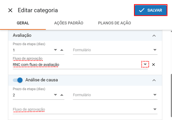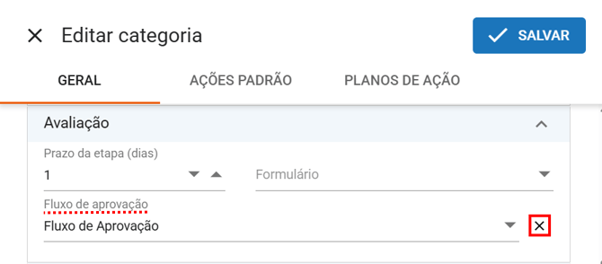 Ao abrir a edição da categoria, na aba "Geral" localize as "Etapas da Tratativa". Escolha a etapa desejada e clique no "X" do campo "Fluxo de aprovação" para remover o vinculo.