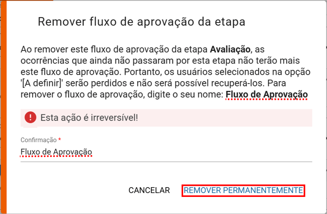 Ao clicar no "X" aparecerá uma tela de confirmação de remoção do vinculo. Para concordar e informar ciência, de que todos os registros feitos nos campos serão removidos permanentemente (sem possibilidade de recuperação), é necessário escrever o nome do fluxo no campo "Confirmação" (conforme a imagem abaixo).