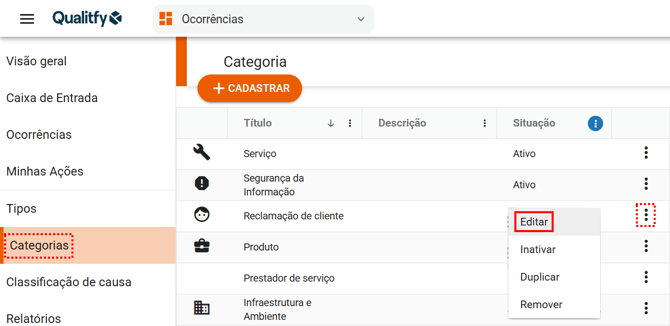 Ao selecionar a opção de "Editar", uma janela será aberta, permitindo realizar alterações na categoria. Existem três abas nesta tela, sendo elas: Geral, Ações Padrão e Planos de ação.