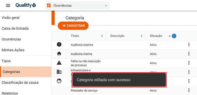Ao "Salvar" a categoria será atualizada e aparecerá a mensagem de confirmação da edição: