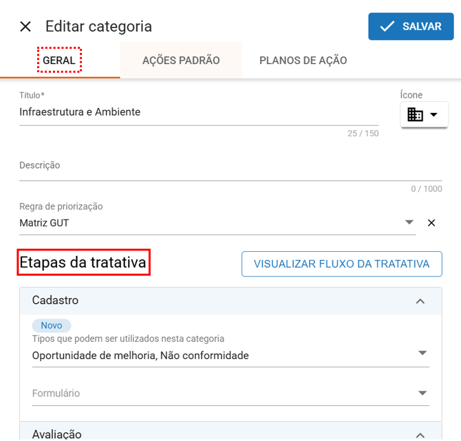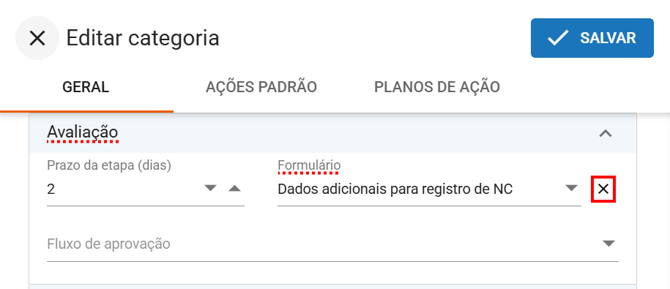Ao abrir a edição da categoria, na aba "Geral" localize as "Etapas da Tratativa". Na abra a etapa desejada e clique no "X" do campo "Formulário do plano de ação" para remover o vinculo.