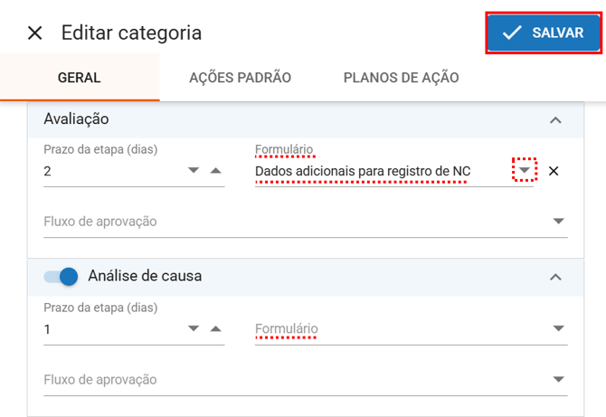 Essa configuração é feita diretamente na aba Categorias, permitindo que cada categoria tenha seu próprio formulário vinculado às etapas, de acordo com as particularidades de cada categoria.