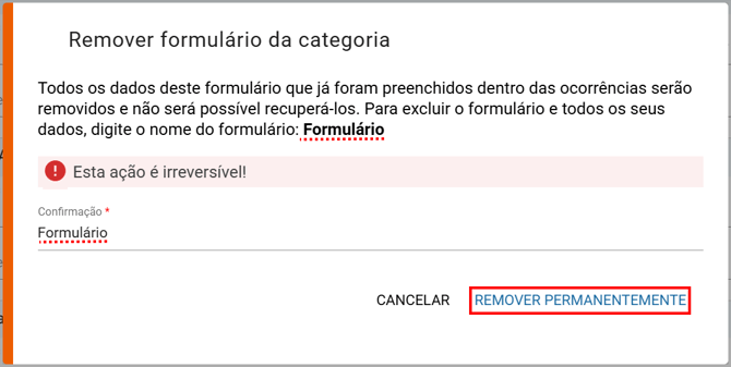 Ao clicar no "X" aparecerá uma tela de confirmação de remoção do vinculo. Para concordar e informar ciência, de que todos os registros feitos nos campos serão removidos permanentemente (sem possibilidade de recuperação), é necessário escrever o nome do formulário no campo "Confirmação" (conforme a imagem abaixo).
