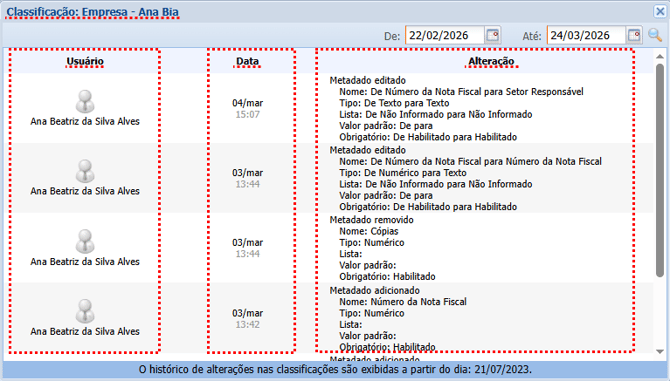 É possível aplicar um filtro por data para identificar exatamente quais alterações foram realizadas em cada período selecionado.