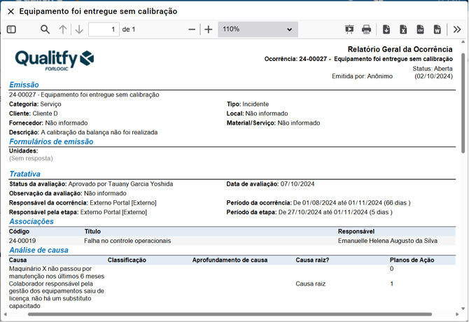 - Análise de causa: informações preenchidas na etapa de análise de causa, e também mostra o vinculo com um plano de ação, se houver.