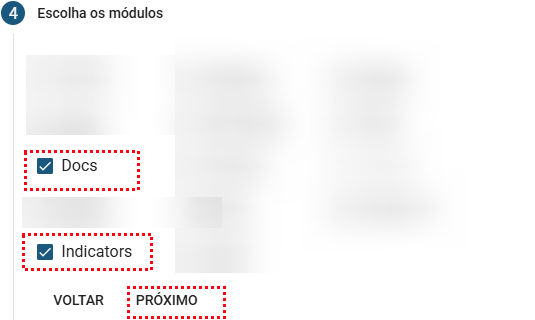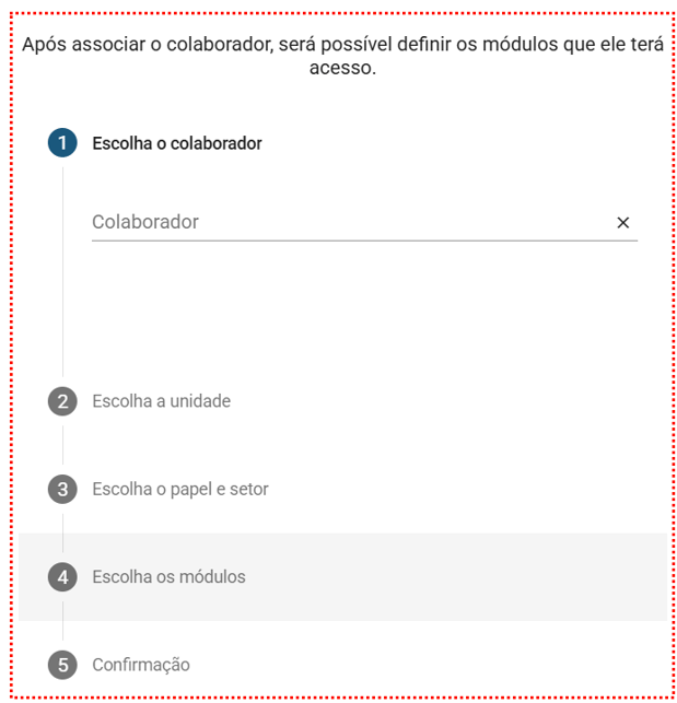 - Escolha os módulos: Marque os módulos que o colaborador terá acesso na nova unidade. Clique em Próximo para prosseguir.