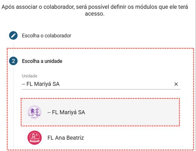 - Escolha a unidade: Indique a unidade que será associada, busque pelo nome da unidade. Clique na unidade que será associada.