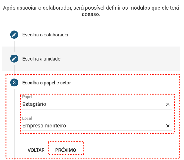 - Escolha o papel e setor : Selecione o papel e o setor que o colaborador irá ter na nova unidade. Clique em Próximo para prosseguir.