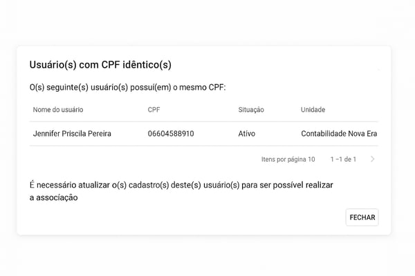 Os colaboradores associados são contabilizados apenas na unidade em que foi cadastrado. Caso você utilize a validação de cpf e tente associar um colaborador de outra unidade na sua, e já exista um colaborador registrado com o mesmo cpf o sistema não permitirá esta associação e exibirá a seguinte mensagem