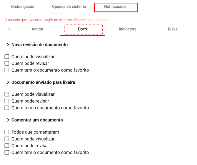 O módulo Docs é responsável pela gestão de documentos dentro do sistema, garantindo controle sobre revisões, comentários e movimentações. Para manter todos os colaboradores informados sobre alterações importantes, é possível configurar notificações por e-mail. Essas notificações são enviadas apenas para usuários que possuem permissão de Visualizar, Revisar ou que tenham marcado o documento como Favorito.