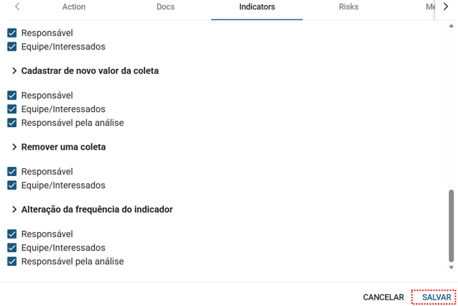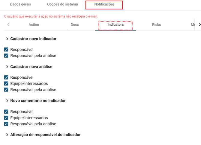O módulo Indicators é uma ferramenta estratégica para monitorar e analisar indicadores de desempenho dentro da organização. Para garantir que todos os envolvidos estejam informados sobre alterações, análises e coletas, o sistema permite configurar notificações automáticas por e-mail. Essas notificações são essenciais para manter a equipe alinhada e evitar atrasos na tomada de decisão.