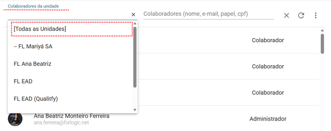 Selecione a opção “Todas as Unidades” no filtro de colaboradores da unidade para visualizar os profissionais de todas as unidades cadastradas.