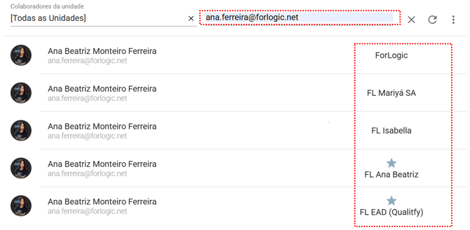 Agora você pode pesquisar o colaborador pelo nome, e-mail, papel ou CPF. Ao realizar a busca, o sistema exibirá o nome do colaborador na listagem juntamente com todas as unidades às quais ele está associado.