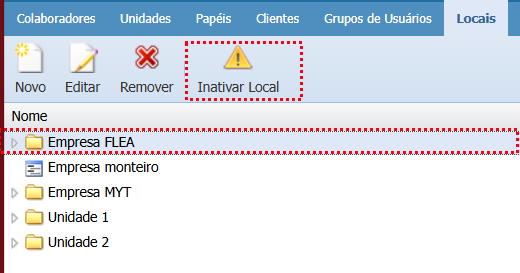 Na aba “Locais”, localize o local que deseja inativar e clique no ícone ![]()