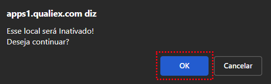 Será exibido um alerta perguntando se você realmente deseja inativar o local. Clique em "Ok" para confirmar.