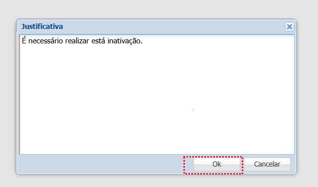 Após confirmar, será obrigatório informar o motivo da inativação. Preencha a justificativa e clique em "Ok".