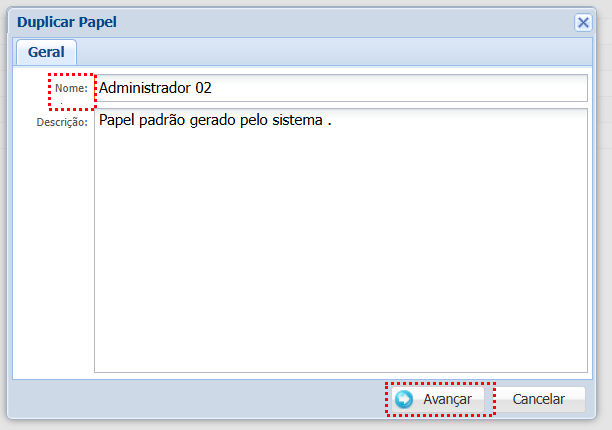 Será exibido uma tela para alterar o nome do papel. Altere e clique em