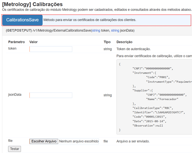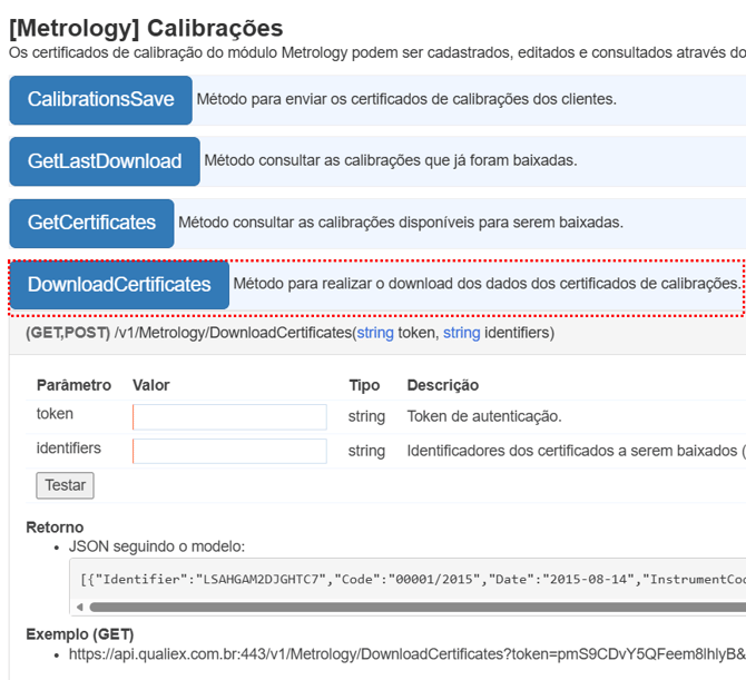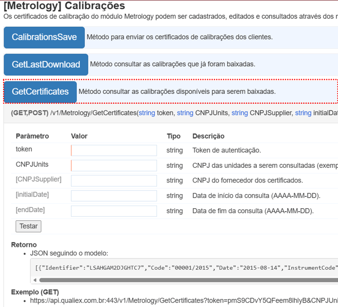 Os certificados de calibração do módulo Metrology podem ser cadastrados, editados e consultados através dos métodos abaixo.