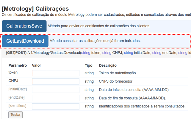 No menu da documentação da API, selecione o método responsável por consultar as calibrações que já foram baixadas.