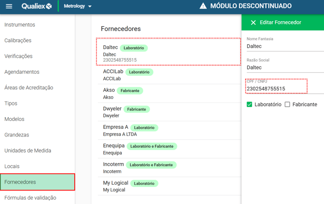 O CNPJ do fornecedor pode ser localizado no módulo Metrology, na aba “Fornecedores”.