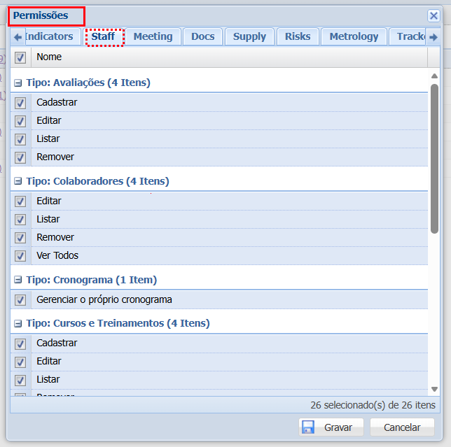 Será exibida a aba de permissões. Em seguida, acesse a opção Staff.