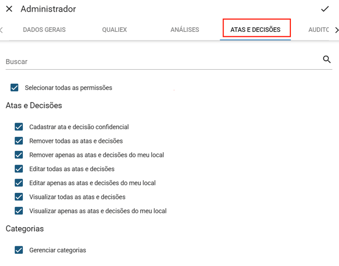 - Visualizar todas as atas e decisões: Permite visualizar todas as atas e decisões mesmo sem ser emissor/responsável ou equipe. (Não é possível visualizar atas confidenciais mesmo com essa permissão habilitada);