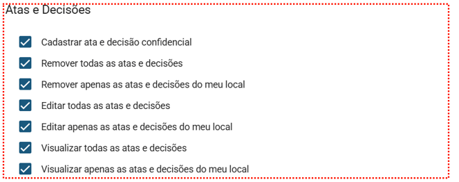 - Visualizar apenas as atas e decisões do meu local: Permite visualizar apenas as atas e decisões cadastradas no local do usuário, mesmo sem ser emissor/responsável ou equipe. (Não é possível visualizar atas confidenciais mesmo com essa permissão habilitada).