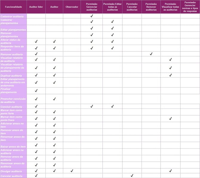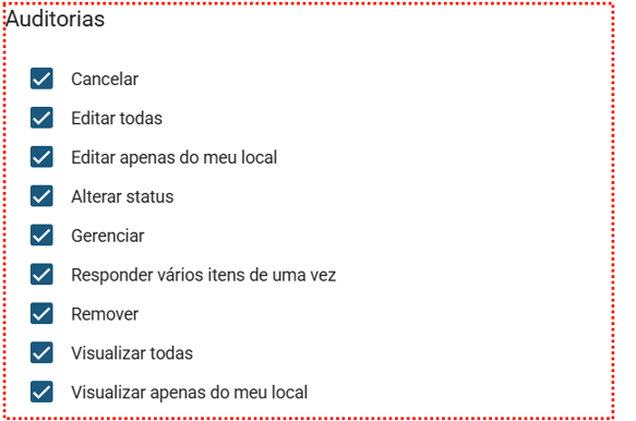 Dentro do módulo de Auditorias existem diversas ações que também requerem que o usuário tenha permissão para executá-las. A seguir, vamos listar as ações e quais as permissões necessárias para executá-las.