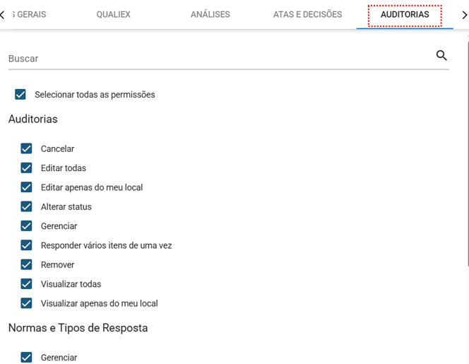 - Editar todas: Permite editar tipos de resposta, normas, planejamentos e auditorias.