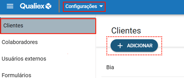 Para cadastrar um cliente, acesse o Módulo Configurações, vá até a aba Clientes e clique em