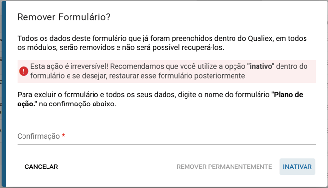- Confirmação: é um campo obrigatório onde devemos inserir o nome do formulário confirmando que realmente desejamos removê-lo, dando a ciência de que essa ação é irreversível não possibilitando a restauração.
