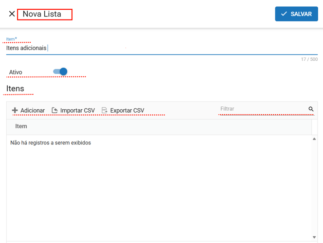 - Ativo: A lista poderá ser usada em campos adicionais e formulários.