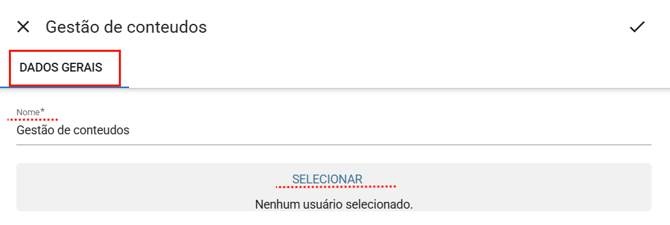 Será exibida a tela para cadastro do grupos de usuários Insira o nome do grupo e clique em "Selecionar" para escolher os participantes.
