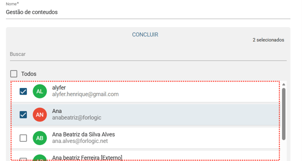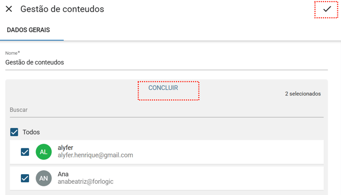 Após selecionar os usuários clique em "Concluir" . E depois clique em