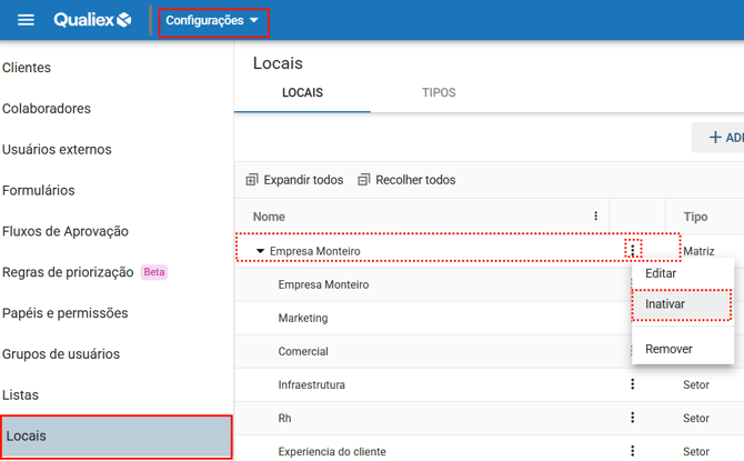 Na aba Locais, dentro do módulo Configurações, escolha o local que deseja inativar, clique no menu de contexto