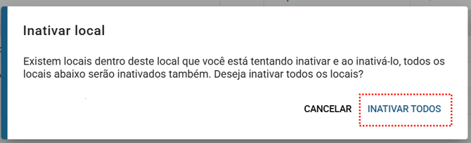 Se existirem mais locais vinculados ao local que você deseja inativar, será exibida uma tela de confirmação. Clique em "Inativar todos".
