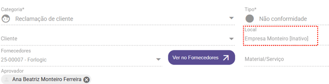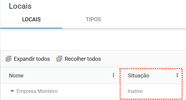 Caso você inative um local que esteja vinculado a algum módulo, o status dele será exibido como inativo.