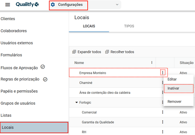 Para inativar um local, é necessário possuir as permissões de “Editar” e “Listar" Locais. Definido na aba Configurações > Papel e permissões.