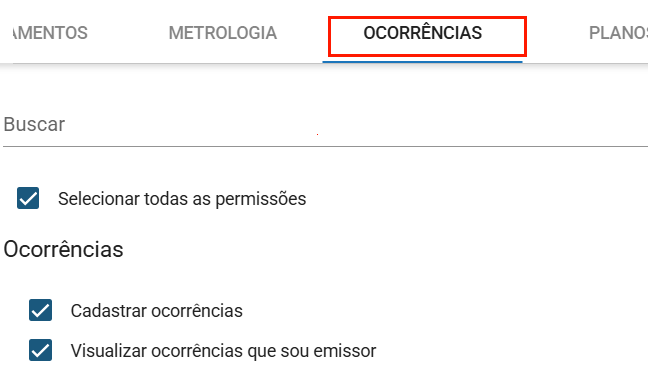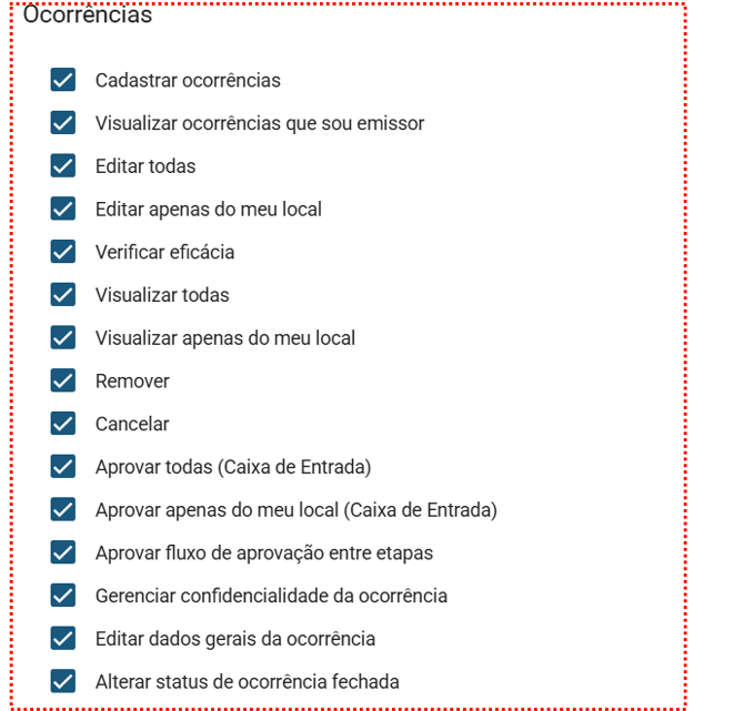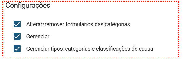 Aqui estão listadas as permissões que o papel poderá ter em relação às configurações específicas do módulo Ocorrências.