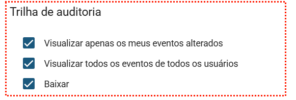 A trilha de auditoria é a funcionalidade que assegura a rastreabilidade das informações do módulo e aqui estão listadas as permissões que o papel poderá ter em relação à trilha de auditoria.