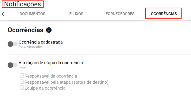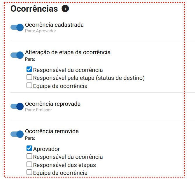 - Ocorrência removida: Avisa ao aprovador, responsável da ocorrência, responsável das etapas e equipe da ocorrência quando a ocorrência em questão for removida no sistema.