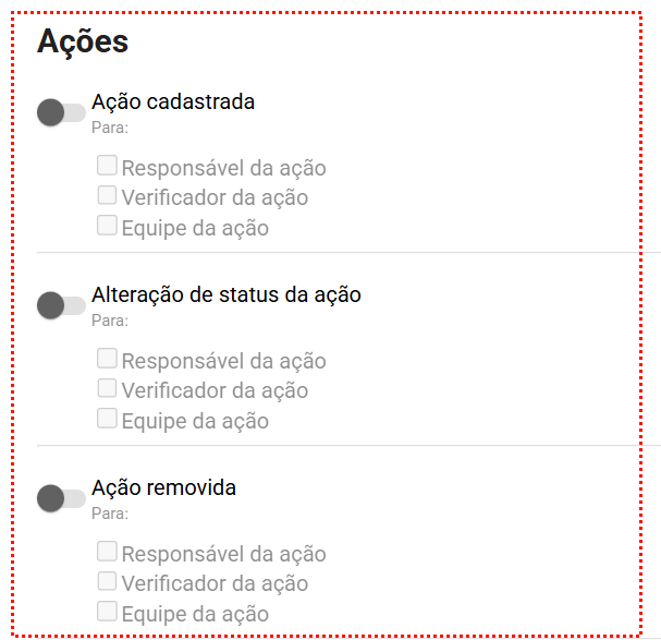 - Ação cadastrada: Informa ao responsável, verificador e equipe da ação quando ela for cadastrada.