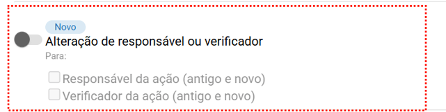 - Alteração de responsável ou verificador: Informa ao responsável da ação (antigo e novo responsável) e ao verificador (antigo e novo verificador) que houve uma alteração de responsável na ação.