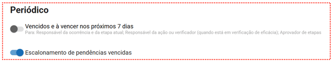 - Vencidos e à vencer nos próximos 7 dias: Toda segunda-feira, informa ao responsável da ocorrência e da etapa atual, responsável da ação ou verificador (quando está em verificação de eficácia) e ao aprovador de etapas sobre as ocorrências e ações vencidas e à vencer nos próximos 7 dias.
