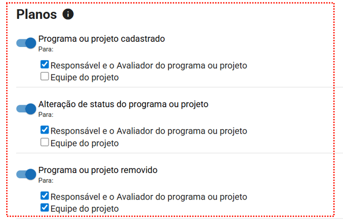 - Alteração de status do programa ou projeto: Envia uma notificação alertando que houve alteração de status do programa ou do projeto. A notificação é enviada de acordo com sua seleção, podendo ser enviada para o "Responsável e o Avaliador do programa ou projeto" e/ou "Equipe do projeto".