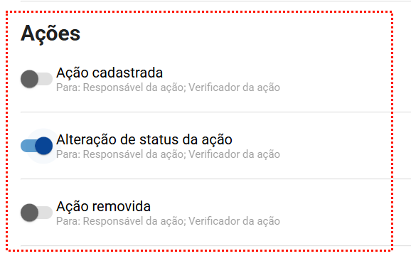 - Alteração de status da ação: Notifica ao responsável e ao verificador da ação quando a mesma tiver seu status alterado, por exemplo: a ação passou de aguardando início para em execução.
