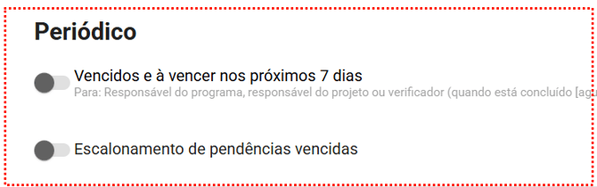 - Programa ou projeto removido: Notifica quando um programa ou um projeto for removido do sistema. A notificação é enviada de acordo com sua seleção, podendo ser enviada para o "Responsável e o Avaliador do programa ou projeto" e/ou "Equipe do projeto".