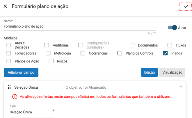 Graças às melhorias recentes, agora é possível modificar o tipo de campo já criado, sem a necessidade de excluí-lo e criar um novo. Isso torna o processo mais ágil e flexível, permitindo ajustes conforme o contexto e a necessidade de uso.
