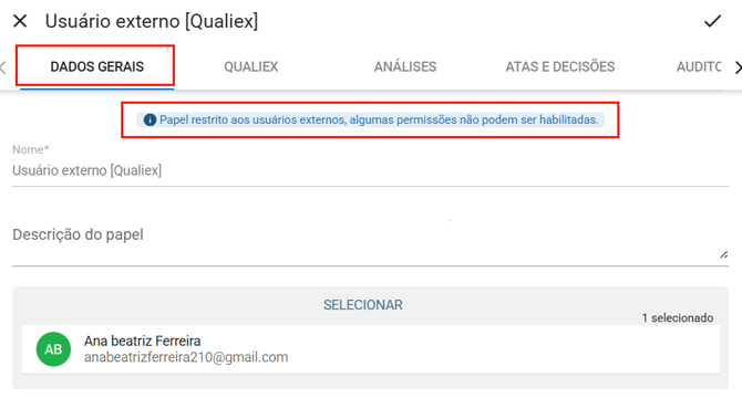 Na primeira aba dados gerais do Usuário externo , será possível visualizar todos os usuários que estão vinculados a este papel.