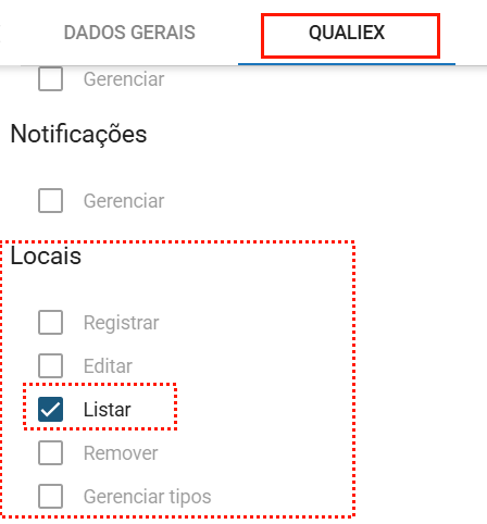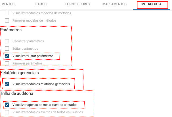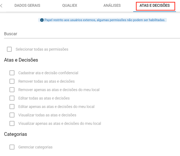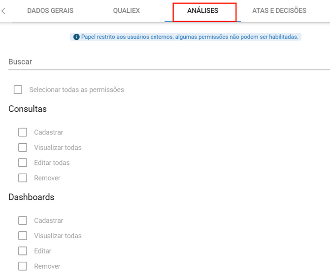 Cada aba posterior a essa, representa o que este papel poderá executar em cada módulo. Todas as opções de permissões desabilitadas são ações restritas para este perfil de usuário, que não podem sofrer nenhuma alteração na configuração. As permissões que aparecerem habilitadas, poderão ser configuradas de acordo com a necessidade de atuação.
